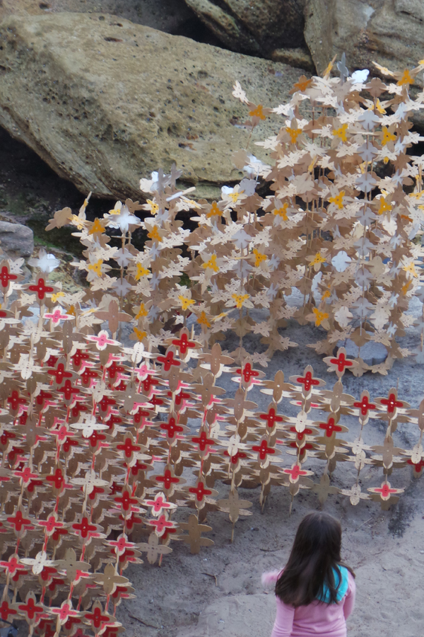 Highlights for me this year were the simple interlocking wooden flowers that spilled out over the rocks and the glass feet tip toeing over the rocks and overlooking the sea.