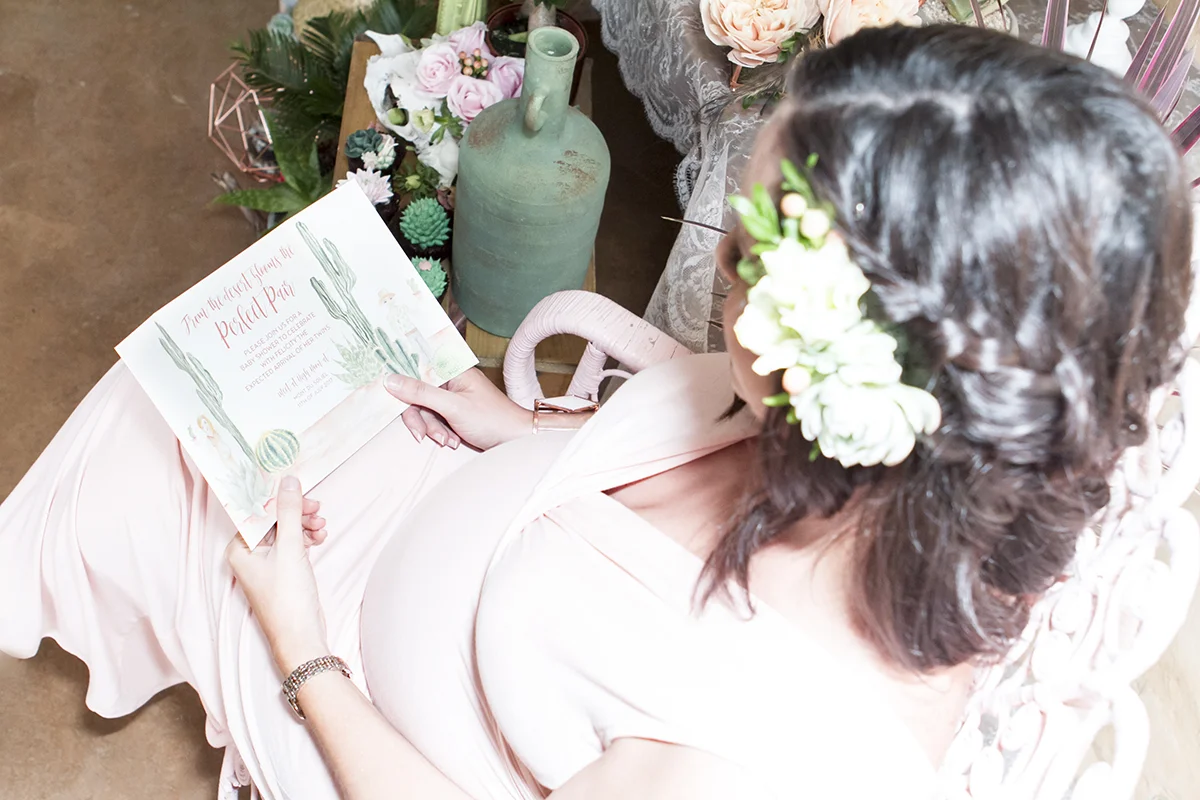 This styled shoot for expected twins was styled by Silk and Cedar Events in Melbourne on behalf of Life's Little Celebrations and featured a number of talented vendors in the collaboration. With a pretty feminine palette of soft pinks and cacti greens it has a beautiful spring vibe and presents an elegant spin on this theme.