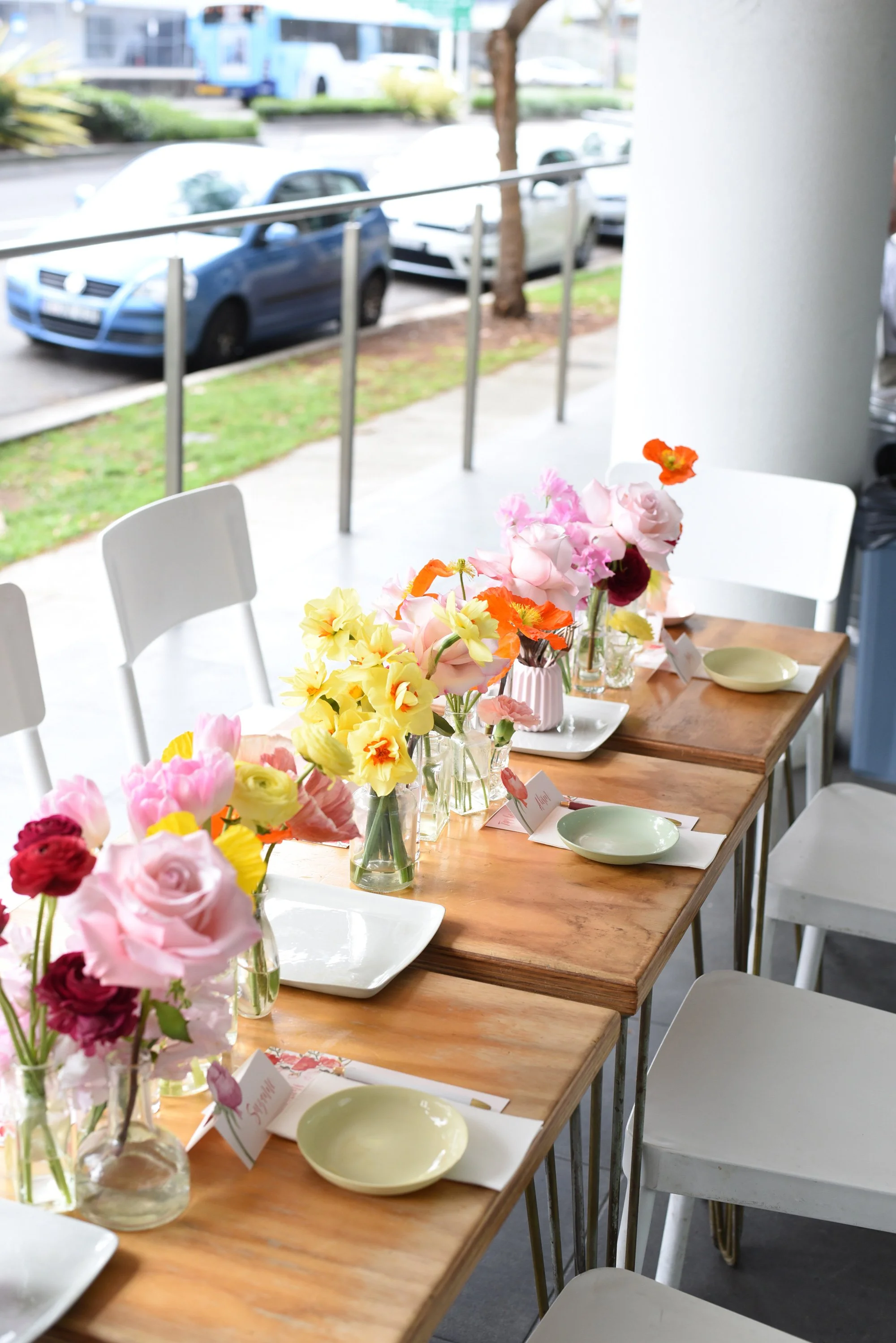 To celebrate we adorned the table with vases of flowers selected and arranged by Ange at Petal met Sugar that took inspiration from the invitation and baby announcement card I sent out to guests.