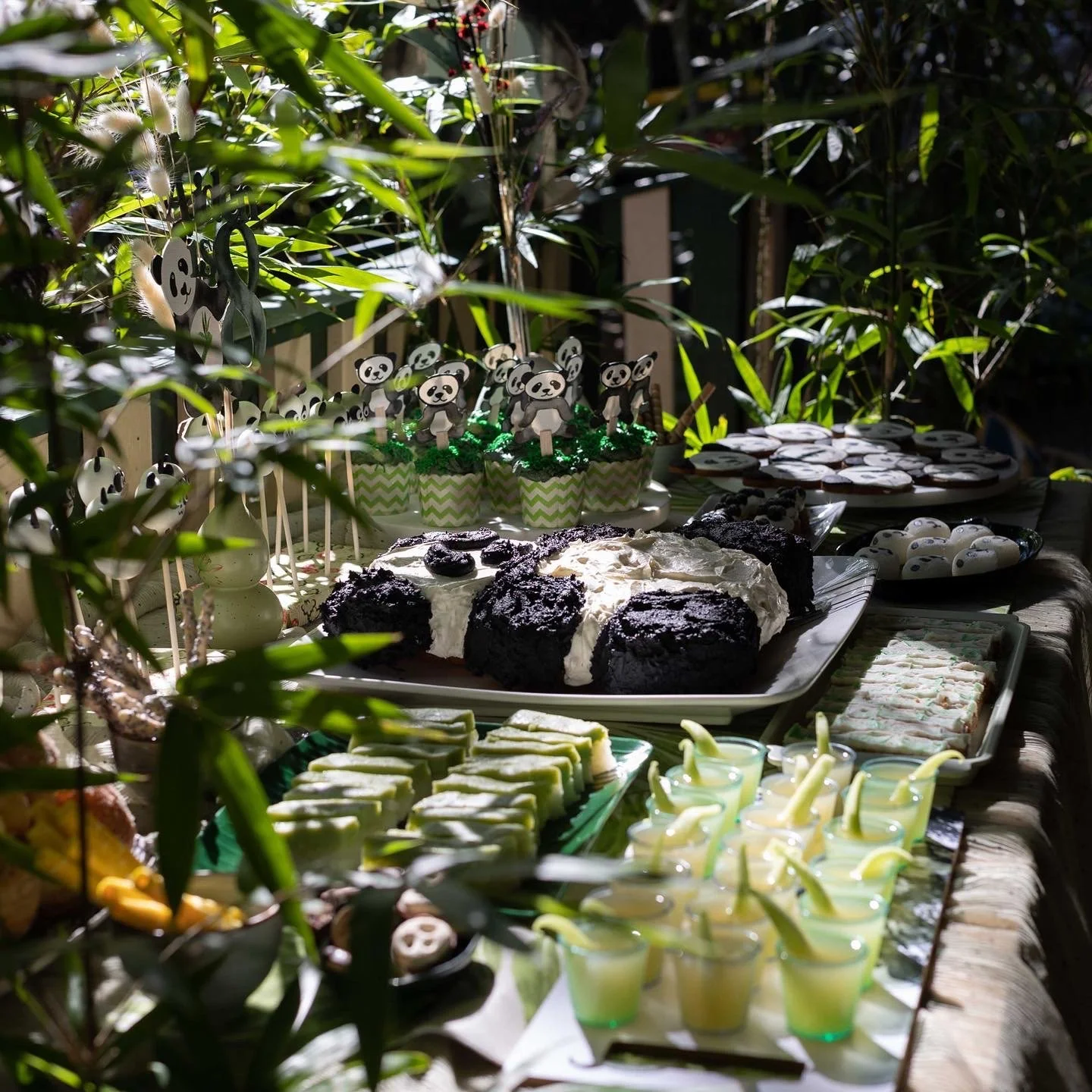 We created a lush bamboo forest setting for this party by bringing in some pots of real bamboo to set up around the table. The green of the garden setting also added to the atmosphere.