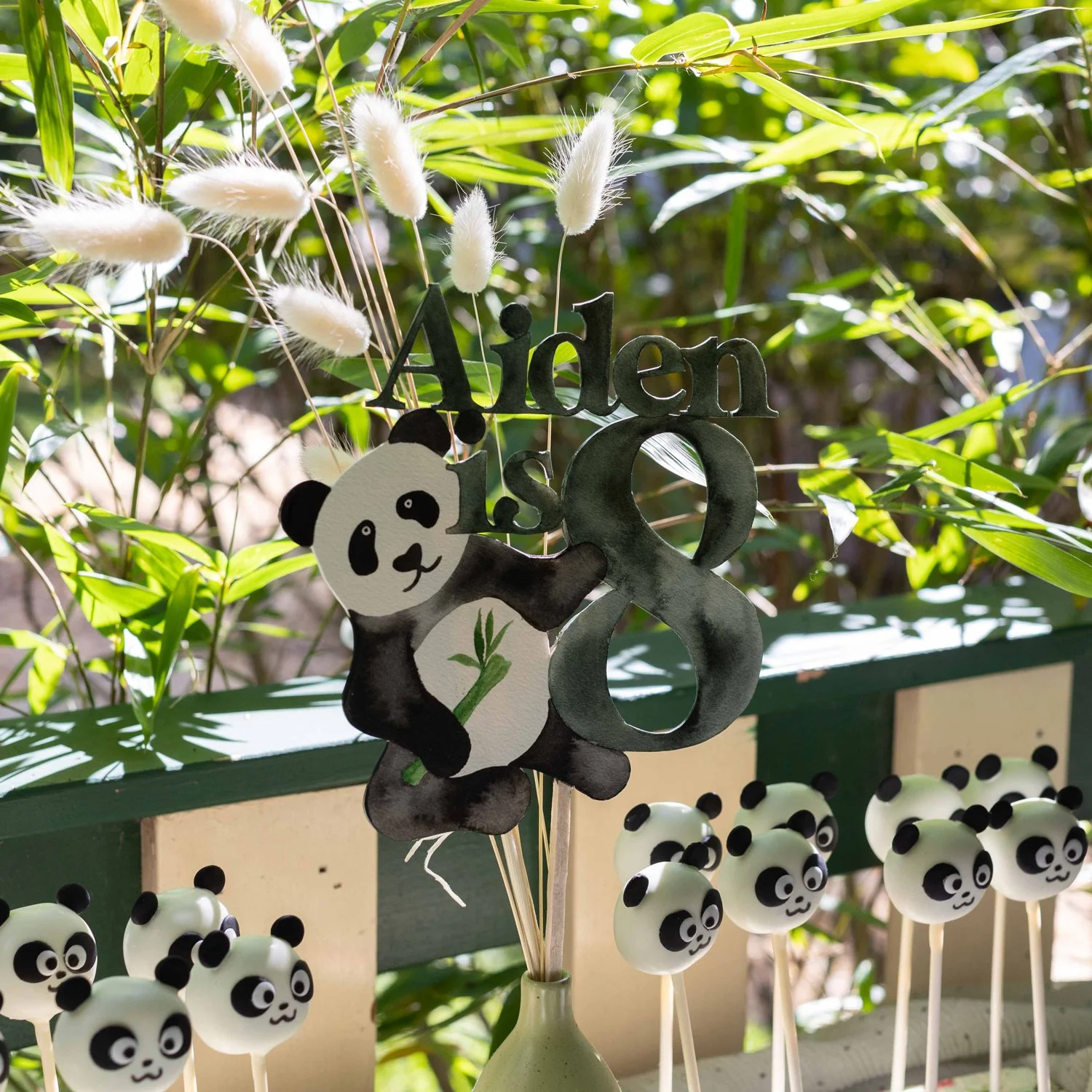 Custom Watercolour topper featuring Aiden’s name, the number 8 and a panda.