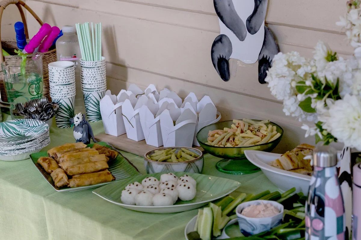 When I plan parties I love taking a theme and exploring it across all the different aspects of an event. Choosing a menu has always been part of that fun and it’s also nice to think of little ‘twists’ to a food idea that can make it fit the theme better. I chose to serve noodle boxes as a more substantial lunch option for hungry pandas, we’ve had noodles before at party boxes which were popular and noodles fit the Chinese background of a Panda’s habitat but the ‘twist’ this year was to make them green tea noodles as a nod to the panda’s diet.