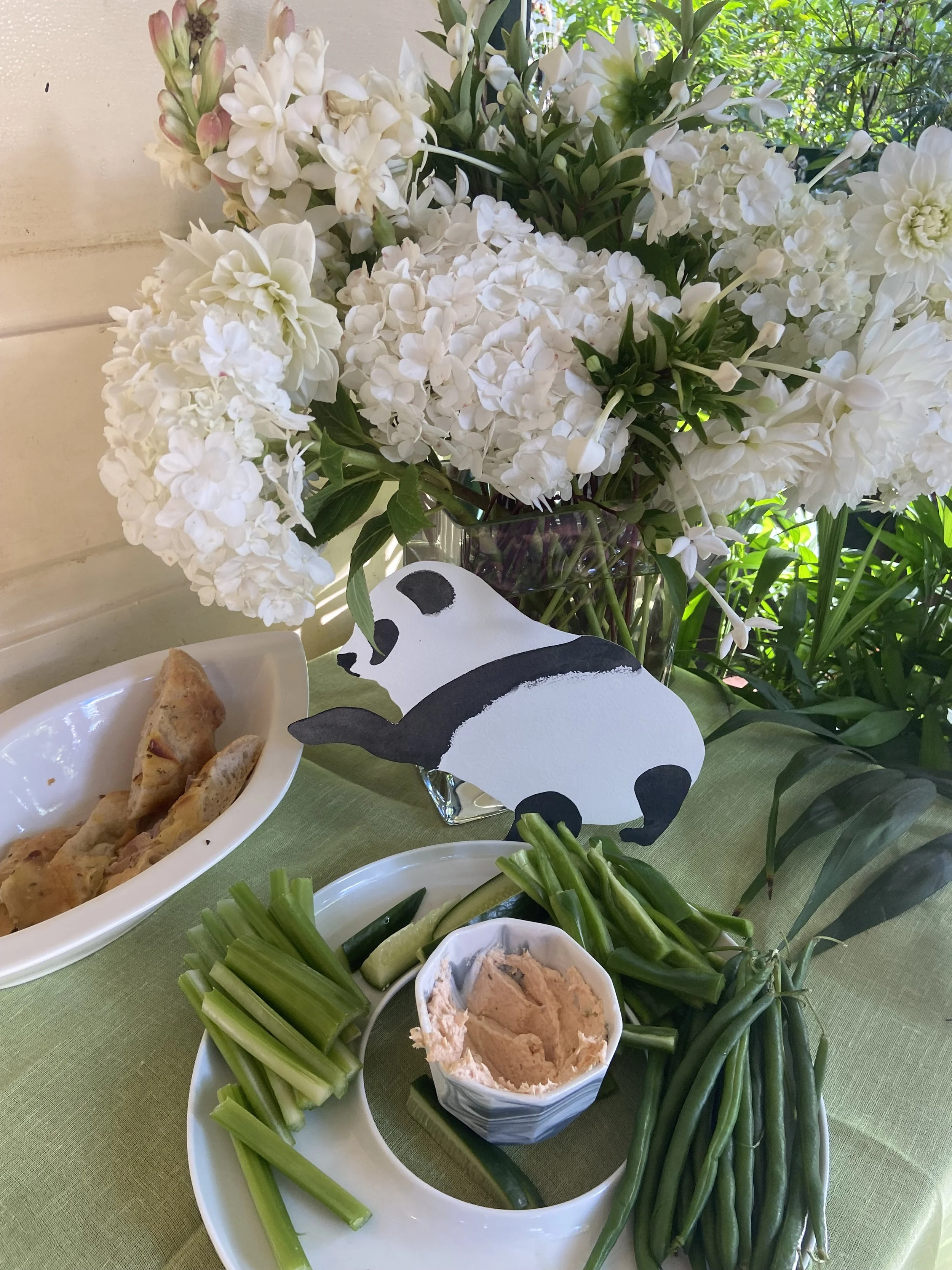 I also set up a secondary table for savoury snacks and plates and drinks. I kept to the theme of the day for this one as well. Rice balls with seaweed cut ears and noses, Chinese style spring rolls and dips with bits of ‘bamboo’ - celery sticks, cucumber sticks and green beans meant guests could pretend they were pandas enjoying the feast. Veggie straws and edible green beans also added to the idea.
